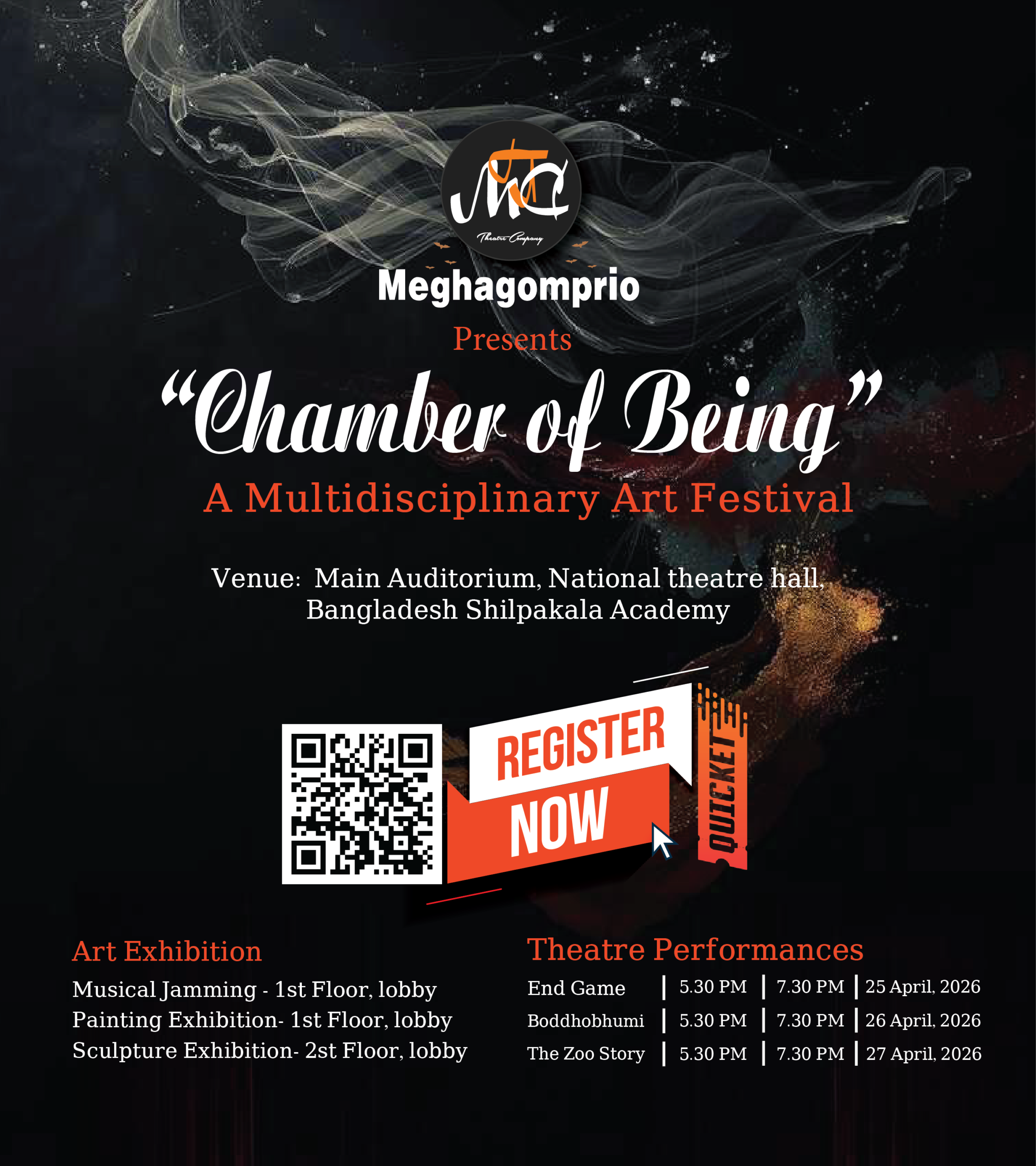 Meghagomprio Theatre Company arrives at the heart of the capital with a landmark three-day cultural journey. Experience a powerful fusion of theatre, contemporary visual arts, and live musical sessions crafted to challenge your perception and stir your soul.